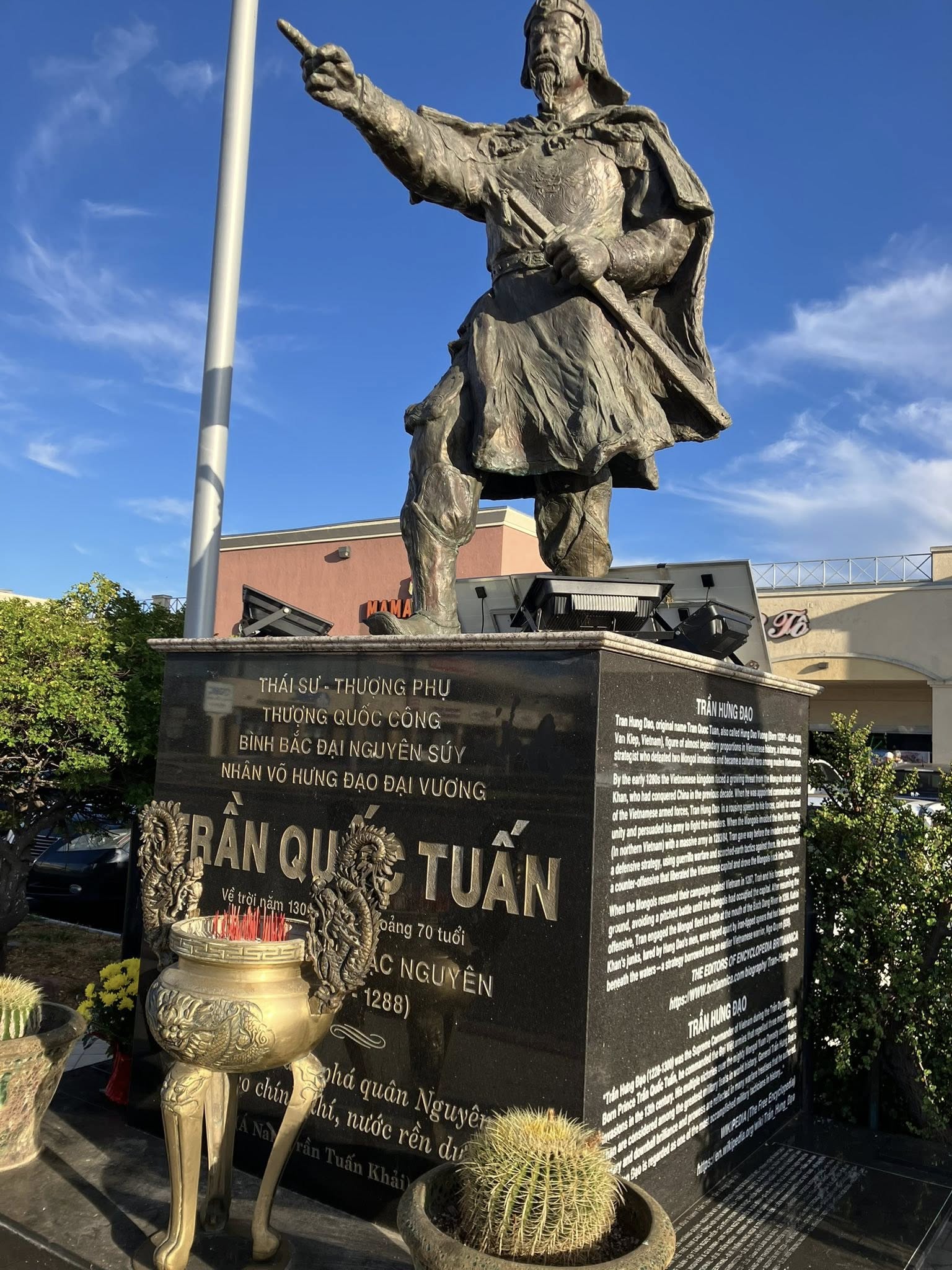 Tôi gật đầu mỉm cười tỏ vẻ cám ơn và bước ra khỏi tiệm. Nắng sớm ban mai, và một vài ngọn gió thổi nhè nhẹ thật dễ chịu. Lái xe ngược về phía Phước Lộc Thọ Mall, tôi đâu xe sát bên tượng Trần Hưng Đạo chụp vài tấm hình. Ngọn cờ vàng ba sọc đỏ bay phât phới hiên ngang dọc đại lộ Bolsa, bên dưới khắc tiểu sử và công lao của Đức Thánh Trần. Dưới cùng là 2 câu thơ của Á Nam Trần Tuấn Khải: